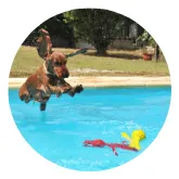 The dogs are taking the floaties off! Your pooches can take a dip in our beautiful pool and enjoy their inner swimmers. Nothing like it and honestly such a fun sight to see. Our dog pool is a great time for dogs that love the water. We have ramps for easy in and out, and a diving dock for pups who love to jump in, too.